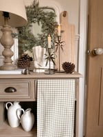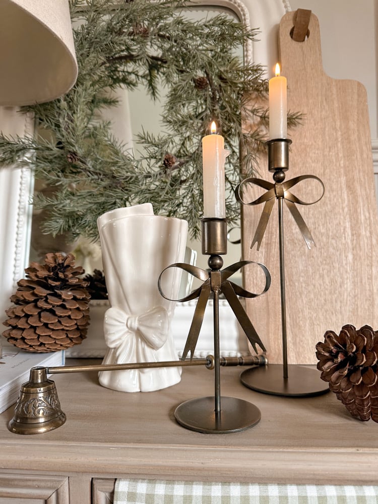 These beautiful brass candlesticks feature a beautiful bow and are perfect paired with our short dinner candles.