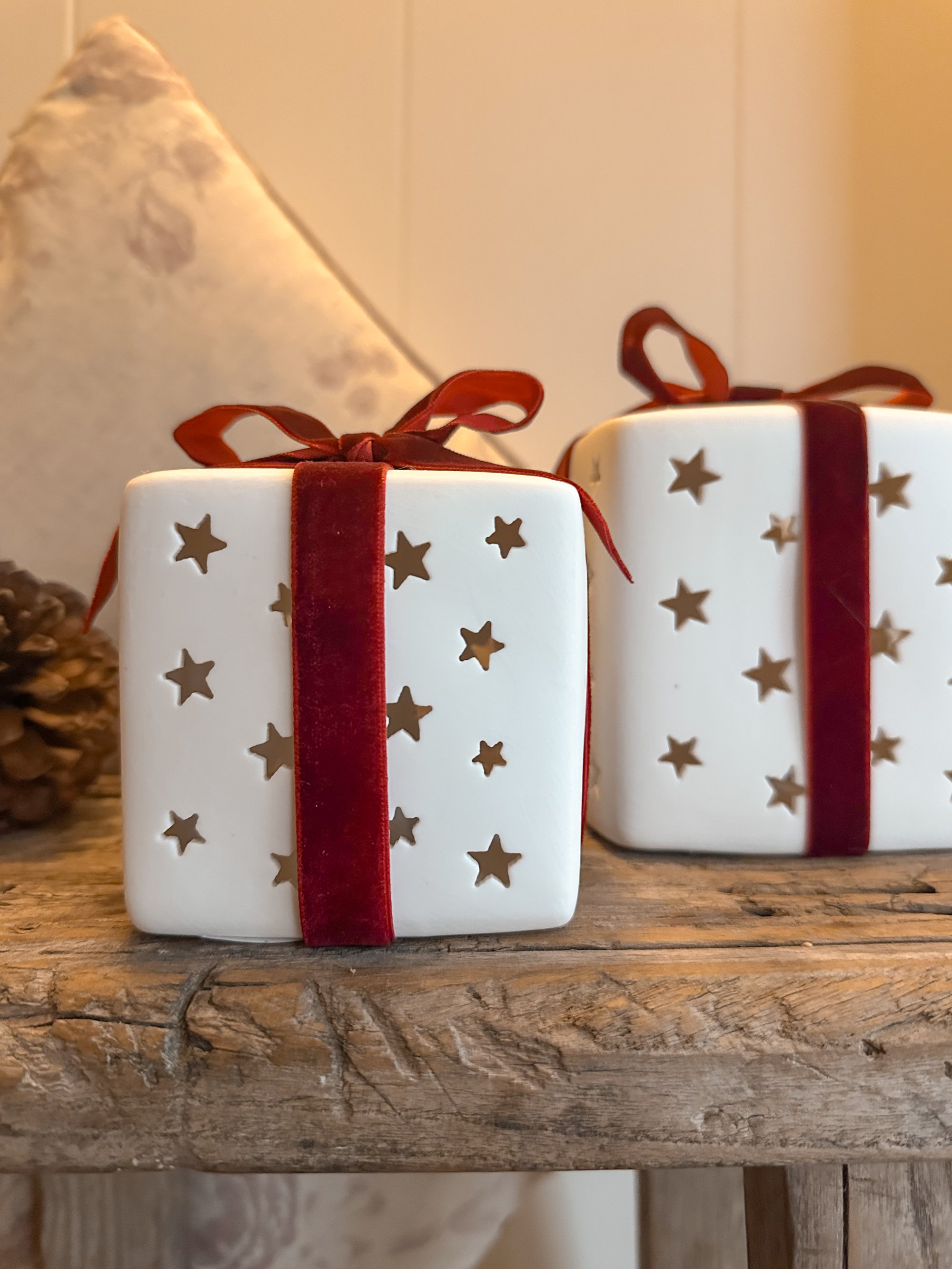 These beautiful ceramic presents are perfect for adding to your winter & festive decor - each finished with a velvet bow and they also light up too!