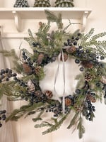 This beautiful wreath is full of winter foliage and finished with beautiful blueberries & pinecones.Perfect with our luxury blueberry stems!