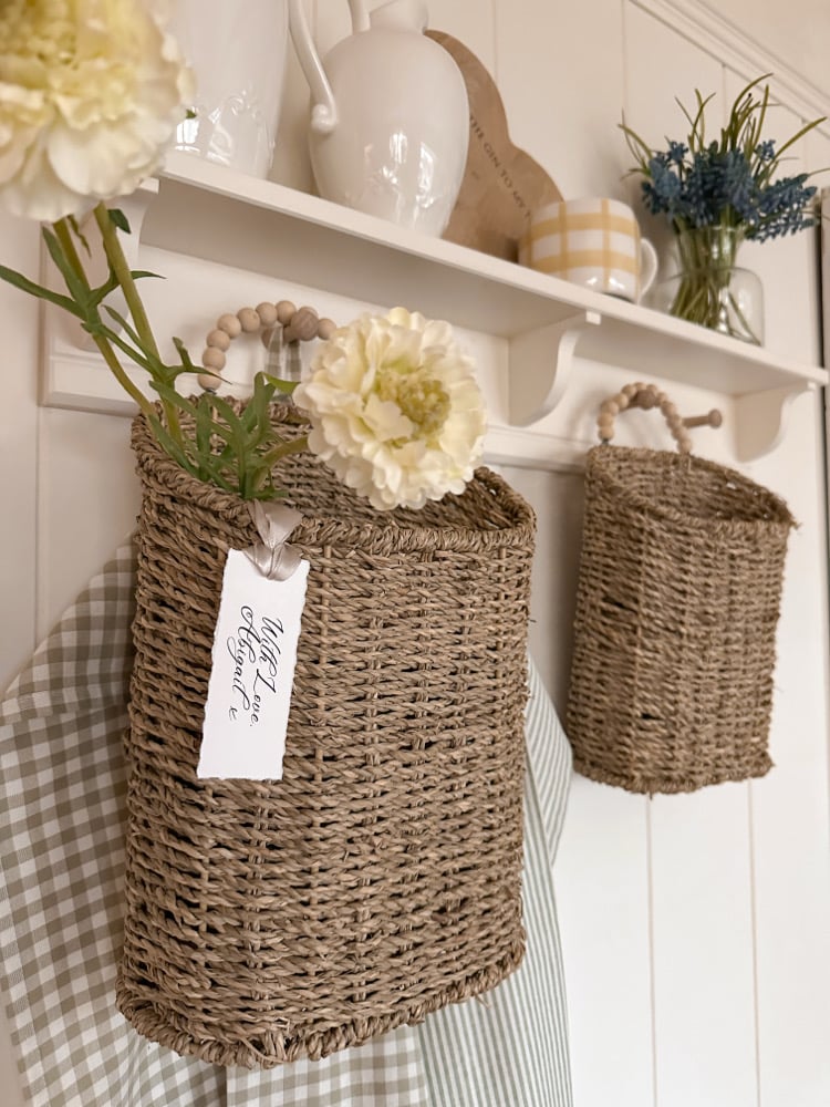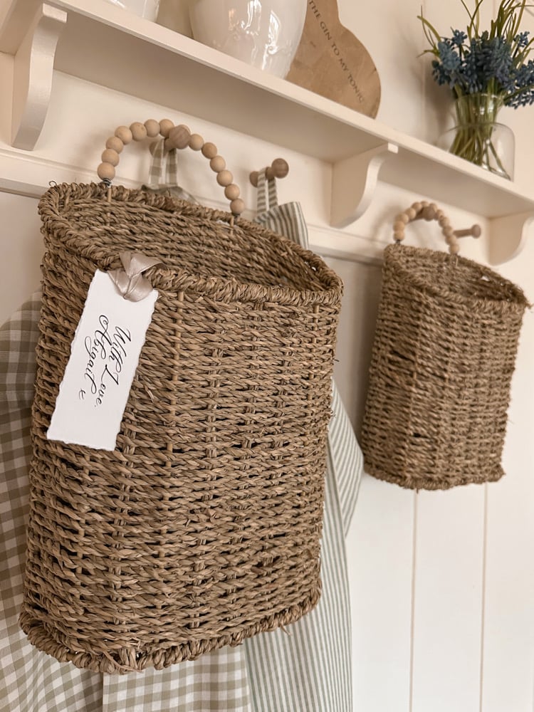 These beautiful seagrass baskets are a staple for your beautiful homes. They come in 2 sizes or as a set of 2 ( one of each ) and are finished with a pretty wooden beaded handle.