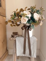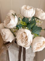 This beautiful bouquet features the most beautiful soft white peonies finished with dainty foliage. Perfect for adding country garden charm to your homes.